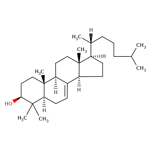 | YMDB00795 | 4,4-dimethyl-5alpha-cholest-7-en-3beta-ol 6384-28-7 | (1R,2R,5S,7R,11R,14R,15R)-2,6,6,15-tetramethyl-14-[(2R)-6-methylheptan-2-yl]tetracyclo[8.7.0.0²,⁷.0¹¹,¹⁵]heptadec-9-en-5-ol | C29H50O 414.7067 | |