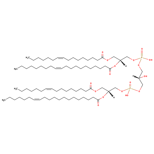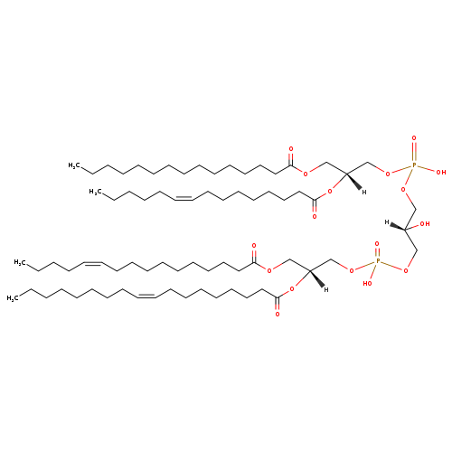 | YMDB08571 | CL(14:1(11Z)/16:1(11Z)/18:1(9Z)/18:1(9Z)) | [(2R)-2,3-bis[(9Z)-octadec-9-enoyloxy]propoxy][(2S)-3-({[(2R)-2-[(11Z)-hexadec-11-enoyloxy]-3-[(11Z)-tetradec-11-enoyloxy]propoxy](hydroxy)phosphoryl}oxy)-2-hydroxypropoxy]phosphinic acid | C75H138O17P2 1373.86 | |