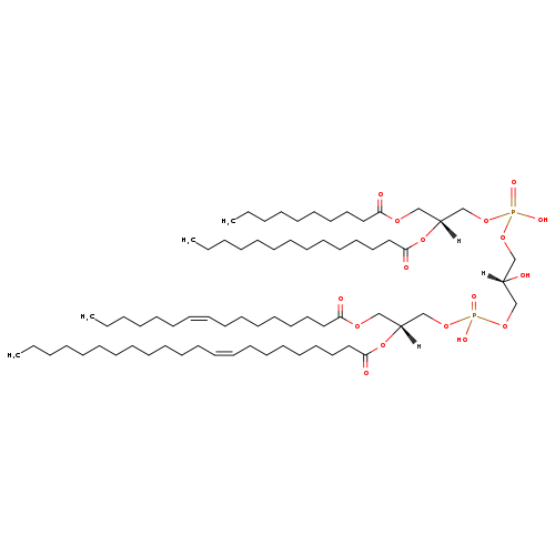 | YMDB02688 | CL(10:0/12:0/18:1(11Z)/20:0) | [(2S)-3-({[(2R)-3-(decanoyloxy)-2-(dodecanoyloxy)propoxy](hydroxy)phosphoryl}oxy)-2-hydroxypropoxy][(2R)-2-(icosanoyloxy)-3-[(11Z)-octadec-11-enoyloxy]propoxy]phosphinic acid | C69H132O17P2 1295.746 | |