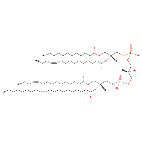 | YMDB06528 | CL(14:0/14:0/14:1(11Z)/18:1(11Z)) | [(2S)-3-({[(2R)-2,3-bis(tetradecanoyloxy)propoxy](hydroxy)phosphoryl}oxy)-2-hydroxypropoxy][(2R)-2-[(11Z)-octadec-11-enoyloxy]-3-[(11Z)-tetradec-11-enoyloxy]propoxy]phosphinic acid | C69H130O17P2 1293.73 | |