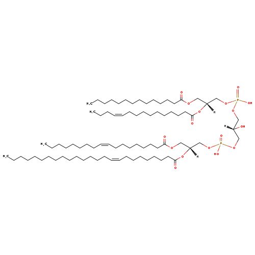 | YMDB06531 | CL(14:0/14:0/14:1(11Z)/20:1(11Z)) | [(2S)-3-({[(2R)-2,3-bis(tetradecanoyloxy)propoxy](hydroxy)phosphoryl}oxy)-2-hydroxypropoxy][(2R)-2-[(11Z)-icos-11-enoyloxy]-3-[(11Z)-tetradec-11-enoyloxy]propoxy]phosphinic acid | C71H134O17P2 1321.784 | |