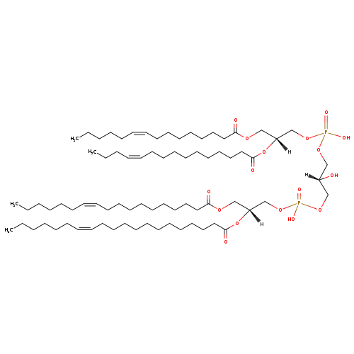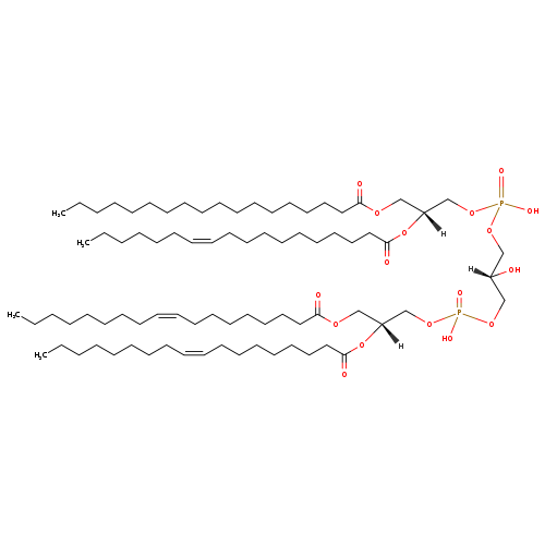 | YMDB11400 | CL(18:0/18:1(11Z)/18:1(9Z)/18:1(9Z)) | [(2R)-2,3-bis[(9Z)-octadec-9-enoyloxy]propoxy][(2S)-2-hydroxy-3-({hydroxy[(2R)-2-[(11Z)-octadec-11-enoyloxy]-3-(octadecanoyloxy)propoxy]phosphoryl}oxy)propoxy]phosphinic acid | C81H152O17P2 1460.038 | |