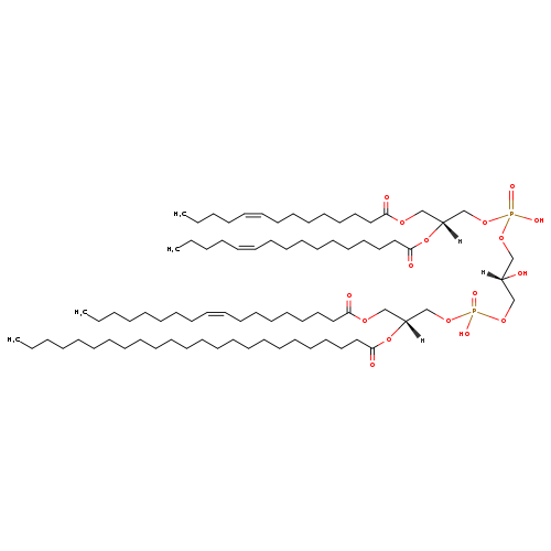 | YMDB09610 | CL(14:1(9Z)/16:1(11Z)/18:1(9Z)/24:0) | [(2R)-2-[(11Z)-hexadec-11-enoyloxy]-3-[(9Z)-tetradec-9-enoyloxy]propoxy][(2R)-2-hydroxy-3-({hydroxy[(2R)-3-[(9Z)-octadec-9-enoyloxy]-2-(tetracosanoyloxy)propoxy]phosphoryl}oxy)propoxy]phosphinic acid | C81H152O17P2 1460.038 | |