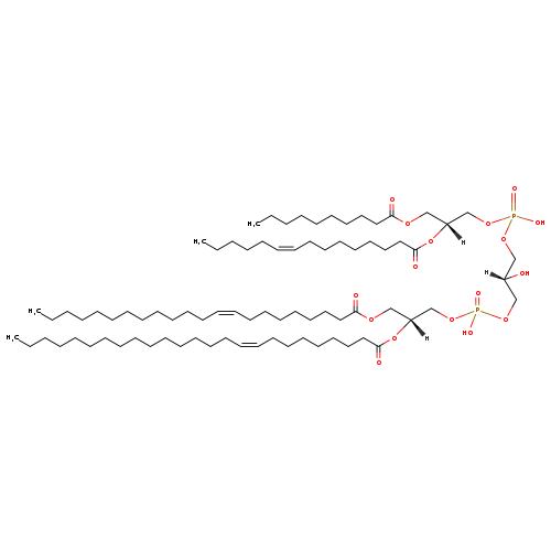 | YMDB02444 | CL(10:0/10:0/18:1(9Z)/30:0) | [(2S)-3-({[(2R)-2,3-bis(decanoyloxy)propoxy](hydroxy)phosphoryl}oxy)-2-hydroxypropoxy][(2R)-3-[(9Z)-octadec-9-enoyloxy]-2-(triacontanoyloxy)propoxy]phosphinic acid | C77H148O17P2 1407.962 | |
