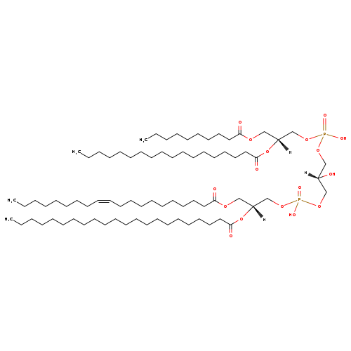 | YMDB02957 | CL(10:0/14:0/18:0/18:1(9Z)) | [(2S)-3-({[(2R)-3-(decanoyloxy)-2-(tetradecanoyloxy)propoxy](hydroxy)phosphoryl}oxy)-2-hydroxypropoxy][(2R)-2-[(9Z)-octadec-9-enoyloxy]-3-(octadecanoyloxy)propoxy]phosphinic acid | C69H132O17P2 1295.746 | |