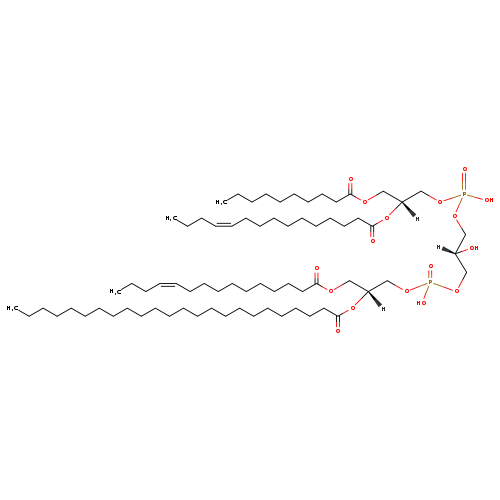 | YMDB04243 | CL(10:0/16:1(11Z)/20:0/20:1(13Z)) | [(2R)-3-({[(2R)-3-(decanoyloxy)-2-[(11Z)-hexadec-11-enoyloxy]propoxy](hydroxy)phosphoryl}oxy)-2-hydroxypropoxy][(2R)-2-[(13Z)-icos-13-enoyloxy]-3-(icosanoyloxy)propoxy]phosphinic acid | C75H142O17P2 1377.892 | |