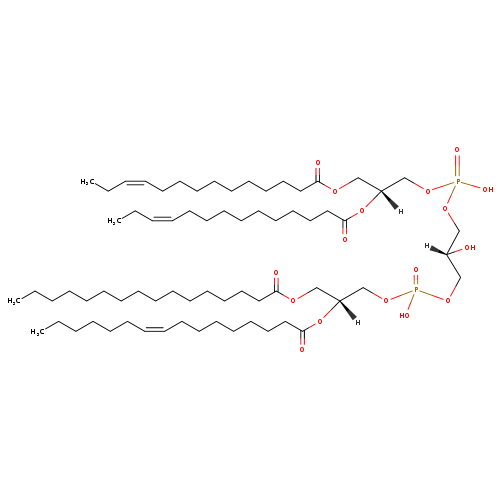 | YMDB08339 | CL(14:1(11Z)/15:1(9Z)/15:1(9Z)/16:0) | [(2R)-3-({[(2R)-2-(hexadecanoyloxy)-3-[(9Z)-pentadec-9-enoyloxy]propoxy](hydroxy)phosphoryl}oxy)-2-hydroxypropoxy][(2R)-2-[(9Z)-pentadec-9-enoyloxy]-3-[(11Z)-tetradec-11-enoyloxy]propoxy]phosphinic acid | C69H128O17P2 1291.714 | |