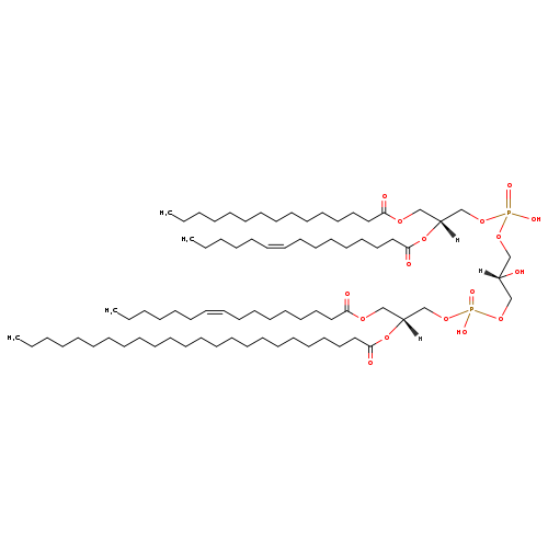 | YMDB10899 | CL(16:0/16:0/18:1(11Z)/22:0) | [(2S)-3-({[(2R)-2,3-bis(hexadecanoyloxy)propoxy](hydroxy)phosphoryl}oxy)-2-hydroxypropoxy][(2R)-2-(docosanoyloxy)-3-[(11Z)-octadec-11-enoyloxy]propoxy]phosphinic acid | C81H156O17P2 1464.07 | |