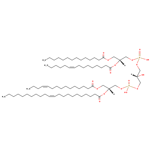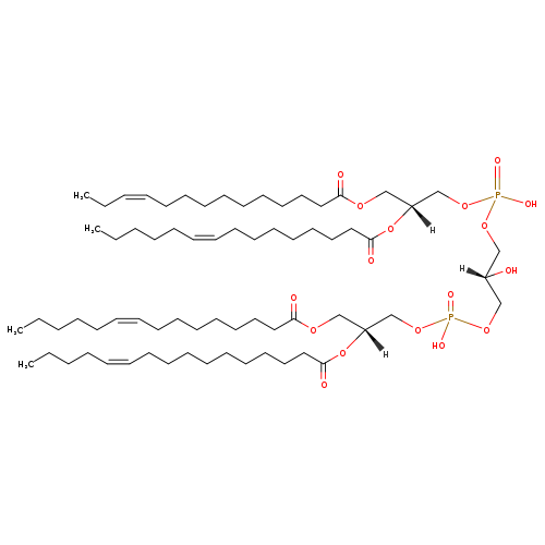 | YMDB07060 | CL(14:0/14:1(9Z)/18:1(11Z)/24:1(9Z)) | [(2S)-2-hydroxy-3-({hydroxy[(2R)-2-[(9Z)-tetradec-9-enoyloxy]-3-(tetradecanoyloxy)propoxy]phosphoryl}oxy)propoxy][(2R)-3-[(11Z)-octadec-11-enoyloxy]-2-[(9Z)-tetracos-9-enoyloxy]propoxy]phosphinic acid | C79H148O17P2 1431.984 | |