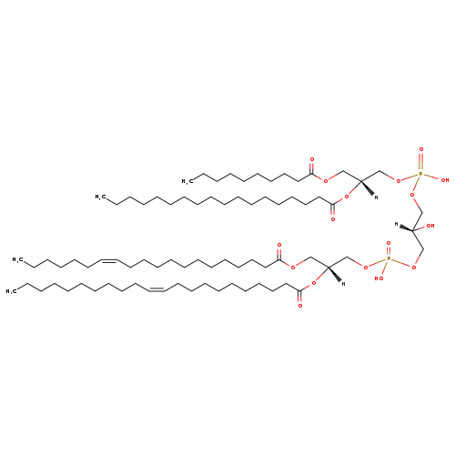 | YMDB03990 | CL(10:0/16:0/16:0/18:1(9Z)) | [(2S)-3-({[(2R)-3-(decanoyloxy)-2-(hexadecanoyloxy)propoxy](hydroxy)phosphoryl}oxy)-2-hydroxypropoxy][(2R)-3-(hexadecanoyloxy)-2-[(9Z)-octadec-9-enoyloxy]propoxy]phosphinic acid | C69H132O17P2 1295.746 | |