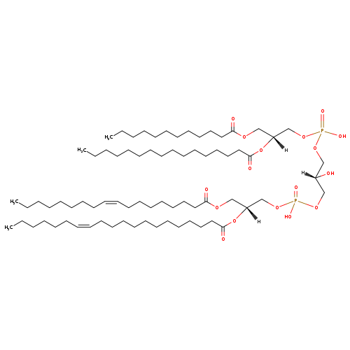 | YMDB05302 | CL(12:0/14:1(11Z)/18:0/20:1(11Z)) | [(2S)-3-({[(2R)-3-(dodecanoyloxy)-2-[(11Z)-tetradec-11-enoyloxy]propoxy](hydroxy)phosphoryl}oxy)-2-hydroxypropoxy][(2R)-2-[(11Z)-icos-11-enoyloxy]-3-(octadecanoyloxy)propoxy]phosphinic acid | C73H138O17P2 1349.838 | |