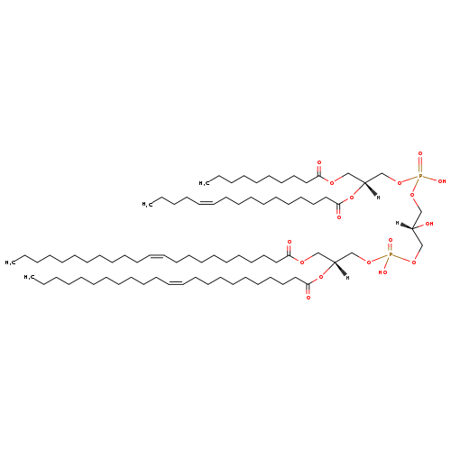 | YMDB05827 | CL(12:0/15:1(11Z)/18:0/27:1(11Z)) | [(2S)-3-({[(2R)-3-(dodecanoyloxy)-2-[(11Z)-pentadec-11-enoyloxy]propoxy](hydroxy)phosphoryl}oxy)-2-hydroxypropoxy][(2R)-2-[(11Z)-heptacos-11-enoyloxy]-3-(octadecanoyloxy)propoxy]phosphinic acid | C81H154O17P2 1462.054 | |