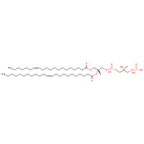 | YMDB08709 | CL(14:1(11Z)/18:0/18:1(9Z)/22:0) | [(2R)-2-(docosanoyloxy)-3-[(9Z)-octadec-9-enoyloxy]propoxy][(2S)-2-hydroxy-3-({hydroxy[(2R)-2-(octadecanoyloxy)-3-[(11Z)-tetradec-11-enoyloxy]propoxy]phosphoryl}oxy)propoxy]phosphinic acid | C81H154O17P2 1462.054 | |