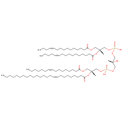 | YMDB09225 | CL(14:1(9Z)/15:0/16:0/27:1(9Z)) | [(2R)-2-[(9Z)-heptacos-9-enoyloxy]-3-(hexadecanoyloxy)propoxy][(2S)-2-hydroxy-3-({hydroxy[(2R)-2-(pentadecanoyloxy)-3-[(9Z)-tetradec-9-enoyloxy]propoxy]phosphoryl}oxy)propoxy]phosphinic acid | C81H154O17P2 1462.054 | |