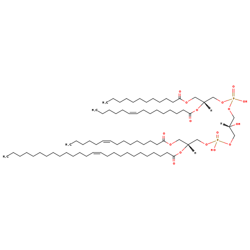 | YMDB05130 | CL(12:0/14:0/20:0/20:1(13Z)) | [(2S)-3-({[(2R)-3-(dodecanoyloxy)-2-(tetradecanoyloxy)propoxy](hydroxy)phosphoryl}oxy)-2-hydroxypropoxy][(2R)-2-[(13Z)-icos-13-enoyloxy]-3-(icosanoyloxy)propoxy]phosphinic acid | C75H144O17P2 1379.908 | |