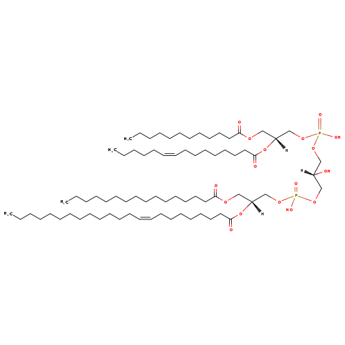 | YMDB06929 | CL(14:0/14:1(9Z)/14:1(9Z)/18:1(11Z)) | [(2R)-2-hydroxy-3-({hydroxy[(2R)-2-[(11Z)-octadec-11-enoyloxy]-3-[(9Z)-tetradec-9-enoyloxy]propoxy]phosphoryl}oxy)propoxy][(2R)-2-[(9Z)-tetradec-9-enoyloxy]-3-(tetradecanoyloxy)propoxy]phosphinic acid | C69H128O17P2 1291.714 | |