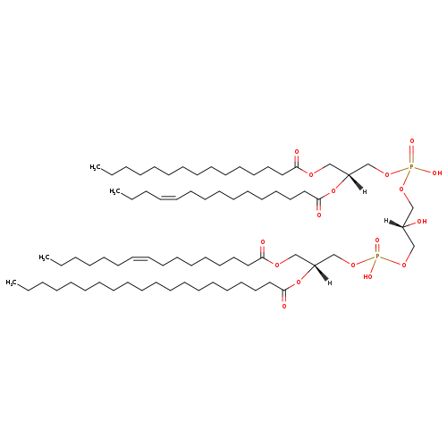 | YMDB06673 | CL(14:0/14:0/18:1(11Z)/26:1(9Z)) | [(2S)-3-({[(2R)-2,3-bis(tetradecanoyloxy)propoxy](hydroxy)phosphoryl}oxy)-2-hydroxypropoxy][(2R)-2-[(10Z)-heptacos-10-enoyloxy]-3-[(11Z)-octadec-11-enoyloxy]propoxy]phosphinic acid | C82H156O17P2 1476.081 | |