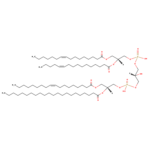 | YMDB11537 | 1-MLCL(0:0/14:0/15:0/16:1(9Z)) | [(2R)-2-[(9Z)-hexadec-9-enoyloxy]-3-(pentadecanoyloxy)propoxy][(2S)-2-hydroxy-3-({hydroxy[(2R)-3-hydroxy-2-(tetradecanoyloxy)propoxy]phosphoryl}oxy)propoxy]phosphinic acid | C54H104O16P2 1071.358 | |