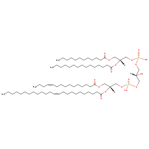 | YMDB06680 | CL(14:0/14:0/18:1(9Z)/24:0) | [(2S)-3-({[(2R)-2,3-bis(tetradecanoyloxy)propoxy](hydroxy)phosphoryl}oxy)-2-hydroxypropoxy][(2R)-3-[(9Z)-octadec-9-enoyloxy]-2-(tetracosanoyloxy)propoxy]phosphinic acid | C79H152O17P2 1436.016 | |