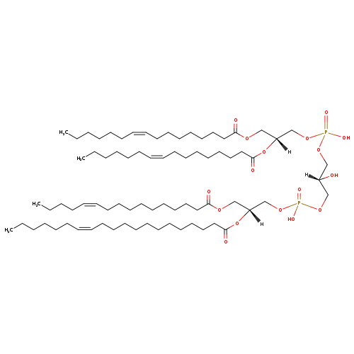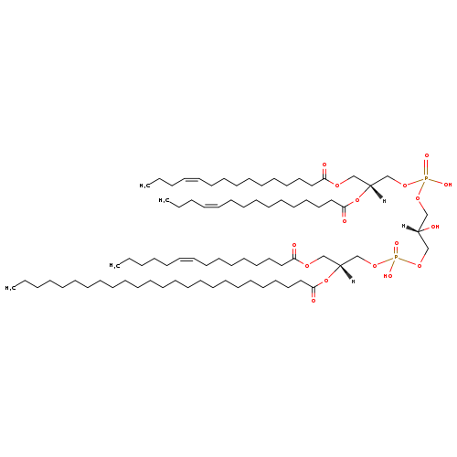 | YMDB11037 | CL(16:0/18:0/18:0/18:1(9Z)) | [(2S)-3-({[(2R)-3-(hexadecanoyloxy)-2-(octadecanoyloxy)propoxy](hydroxy)phosphoryl}oxy)-2-hydroxypropoxy][(2R)-2-[(9Z)-octadec-9-enoyloxy]-3-(octadecanoyloxy)propoxy]phosphinic acid | C79H152O17P2 1436.016 | |
