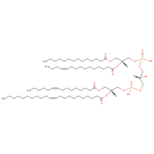 | YMDB06738 | CL(14:0/14:1(11Z)/14:1(9Z)/24:1(9Z)) | [(2S)-2-hydroxy-3-({hydroxy[(2R)-2-[(11Z)-tetradec-11-enoyloxy]-3-(tetradecanoyloxy)propoxy]phosphoryl}oxy)propoxy][(2R)-2-[(9Z)-tetracos-9-enoyloxy]-3-[(9Z)-tetradec-9-enoyloxy]propoxy]phosphinic acid | C75H140O17P2 1375.876 | |