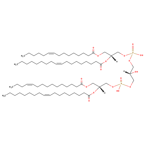 | YMDB10068 | CL(15:0/15:1(9Z)/15:1(11Z)/23:1(9Z)) | [(2S)-2-hydroxy-3-({hydroxy[(2R)-2-[(9Z)-pentadec-9-enoyloxy]-3-(pentadecanoyloxy)propoxy]phosphoryl}oxy)propoxy][(2R)-3-[(11Z)-pentadec-11-enoyloxy]-2-[(9Z)-tricos-9-enoyloxy]propoxy]phosphinic acid | C77H144O17P2 1403.93 | |