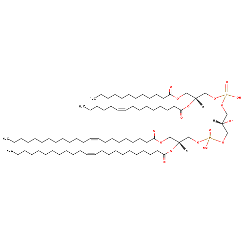 | YMDB05718 | CL(12:0/15:0/18:0/27:1(9Z)) | [(2S)-3-({[(2R)-3-(dodecanoyloxy)-2-(pentadecanoyloxy)propoxy](hydroxy)phosphoryl}oxy)-2-hydroxypropoxy][(2R)-2-[(9Z)-heptacos-9-enoyloxy]-3-(octadecanoyloxy)propoxy]phosphinic acid | C81H156O17P2 1464.07 | |