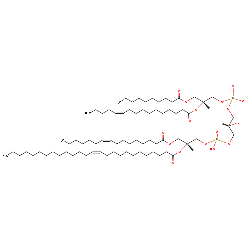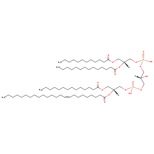 | YMDB03415 | CL(10:0/14:1(9Z)/16:1(11Z)/26:1(11Z)) | [(2R)-3-(decanoyloxy)-2-[(9Z)-tetradec-9-enoyloxy]propoxy][(2R)-3-({[(2R)-2-[(12Z)-hexacos-12-enoyloxy]-3-[(11Z)-hexadec-11-enoyloxy]propoxy](hydroxy)phosphoryl}oxy)-2-hydroxypropoxy]phosphinic acid | C75H140O17P2 1375.876 | |