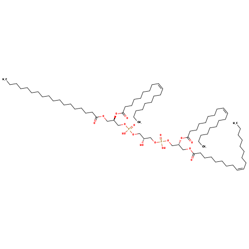 | YMDB01120 | CL(1'-[18:0/18:1(9Z)],3'-[18:1(9Z)/18:1(9Z)]) | [(2R)-2,3-bis[(9Z)-octadec-9-enoyloxy]propoxy][(2R)-2-hydroxy-3-({hydroxy[(2R)-2-[(9Z)-octadec-9-enoyloxy]-3-(octadecanoyloxy)propoxy]phosphoryl}oxy)propoxy]phosphinic acid | C81H152O17P2 1460.0109 | |