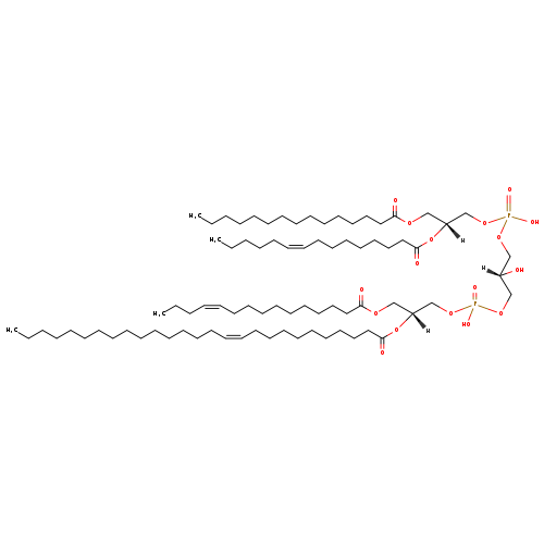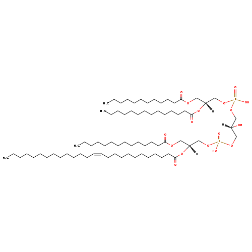 | YMDB06745 | CL(14:0/14:1(11Z)/14:1(9Z)/30:0) | [(2S)-2-hydroxy-3-({hydroxy[(2R)-2-[(11Z)-tetradec-11-enoyloxy]-3-(tetradecanoyloxy)propoxy]phosphoryl}oxy)propoxy][(2R)-3-[(9Z)-tetradec-9-enoyloxy]-2-(triacontanoyloxy)propoxy]phosphinic acid | C81H154O17P2 1462.054 | |