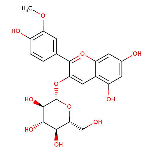 | YMDB01766 | Peonidin 3-O-glucoside 68795-37-9 | 5,7-dihydroxy-2-(4-hydroxy-3-methoxyphenyl)-3-{[(2S,3R,4S,5S,6R)-3,4,5-trihydroxy-6-(hydroxymethyl)oxan-2-yl]oxy}-1lambda4-chromen-1-ylium | C22H23O11 463.4114 | |