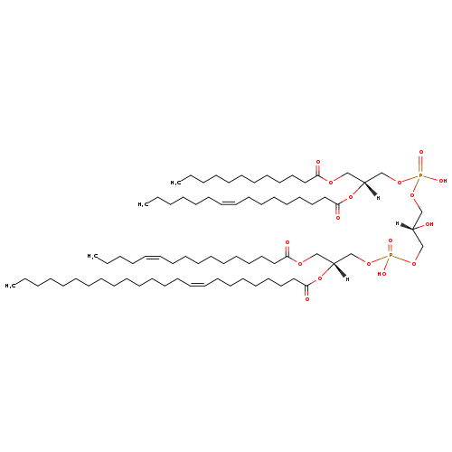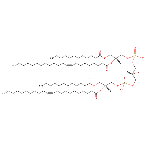 | YMDB07008 | CL(14:0/14:1(9Z)/16:1(11Z)/24:1(9Z)) | [(2R)-3-[(11Z)-hexadec-11-enoyloxy]-2-[(9Z)-tetracos-9-enoyloxy]propoxy][(2S)-2-hydroxy-3-({hydroxy[(2R)-2-[(9Z)-tetradec-9-enoyloxy]-3-(tetradecanoyloxy)propoxy]phosphoryl}oxy)propoxy]phosphinic acid | C77H144O17P2 1403.93 | |