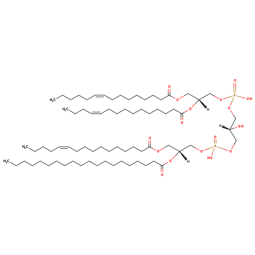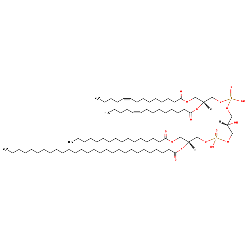 | YMDB10080 | CL(15:0/15:1(9Z)/15:1(9Z)/25:1(11Z)) | [(2R)-2-hydroxy-3-({hydroxy[(2R)-2-[(11Z)-pentacos-11-enoyloxy]-3-[(9Z)-pentadec-9-enoyloxy]propoxy]phosphoryl}oxy)propoxy][(2R)-2-[(9Z)-pentadec-9-enoyloxy]-3-(pentadecanoyloxy)propoxy]phosphinic acid | C79H148O17P2 1431.984 | |