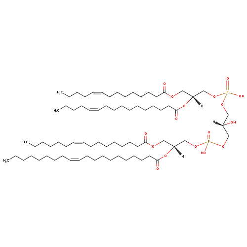 | YMDB09568 | CL(14:1(9Z)/16:1(11Z)/16:1(9Z)/20:1(11Z)) | [(2S)-3-({[(2R)-2-[(11Z)-hexadec-11-enoyloxy]-3-[(9Z)-tetradec-9-enoyloxy]propoxy](hydroxy)phosphoryl}oxy)-2-hydroxypropoxy][(2R)-3-[(9Z)-hexadec-9-enoyloxy]-2-[(11Z)-icos-11-enoyloxy]propoxy]phosphinic acid | C75H138O17P2 1373.86 | |