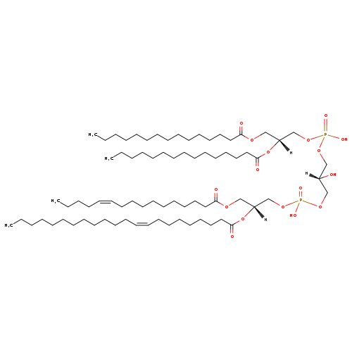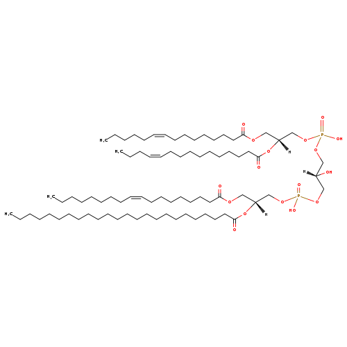| YMDB11413 | CL(18:1(11Z)/18:1(9Z)/18:1(9Z)/18:1(11Z)) | [(2R)-2-hydroxy-3-({hydroxy[(2R)-2-[(11Z)-octadec-11-enoyloxy]-3-[(9Z)-octadec-9-enoyloxy]propoxy]phosphoryl}oxy)propoxy][(2R)-3-[(11Z)-octadec-11-enoyloxy]-2-[(9Z)-octadec-9-enoyloxy]propoxy]phosphinic acid | C81H150O17P2 1458.022 | |