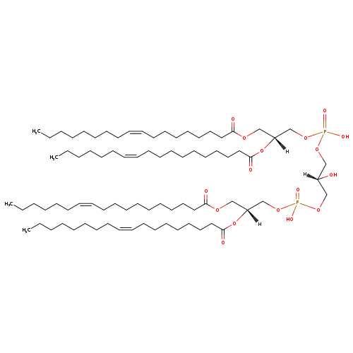 | YMDB11416 | CL(18:1(9Z)/18:1(11Z)/18:1(11Z)/18:1(9Z)) | [(2S)-2-hydroxy-3-({hydroxy[(2R)-2-[(11Z)-octadec-11-enoyloxy]-3-[(9Z)-octadec-9-enoyloxy]propoxy]phosphoryl}oxy)propoxy][(2R)-3-[(11Z)-octadec-11-enoyloxy]-2-[(9Z)-octadec-9-enoyloxy]propoxy]phosphinic acid | C81H150O17P2 1458.022 | |
