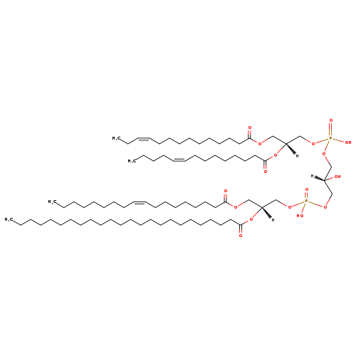 | YMDB08095 | CL(14:1(11Z)/14:1(9Z)/18:1(9Z)/24:0) | [(2R)-2-hydroxy-3-({hydroxy[(2R)-3-[(9Z)-octadec-9-enoyloxy]-2-(tetracosanoyloxy)propoxy]phosphoryl}oxy)propoxy][(2R)-3-[(11Z)-tetradec-11-enoyloxy]-2-[(9Z)-tetradec-9-enoyloxy]propoxy]phosphinic acid | C79H148O17P2 1431.984 | |