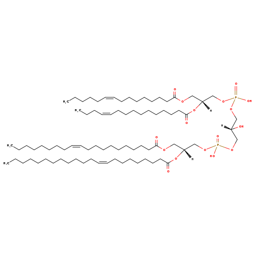 | YMDB10399 | CL(15:1(11Z)/15:1(9Z)/16:1(11Z)/18:0) | [(2R)-3-({[(2R)-3-[(11Z)-hexadec-11-enoyloxy]-2-(octadecanoyloxy)propoxy](hydroxy)phosphoryl}oxy)-2-hydroxypropoxy][(2R)-3-[(11Z)-pentadec-11-enoyloxy]-2-[(9Z)-pentadec-9-enoyloxy]propoxy]phosphinic acid | C73H136O17P2 1347.822 | |