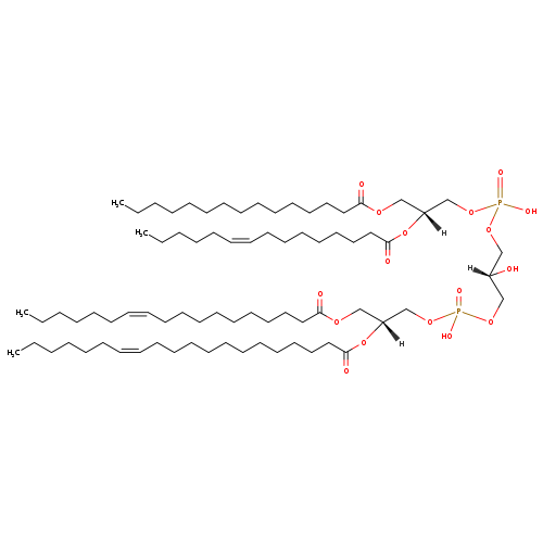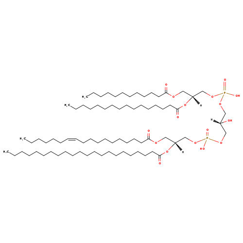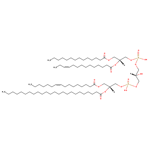 | YMDB09129 | CL(14:1(9Z)/14:1(9Z)/18:1(9Z)/24:1(9Z)) | [(2S)-3-({[(2R)-2,3-bis[(9Z)-tetradec-9-enoyloxy]propoxy](hydroxy)phosphoryl}oxy)-2-hydroxypropoxy][(2R)-3-[(9Z)-octadec-9-enoyloxy]-2-[(9Z)-tetracos-9-enoyloxy]propoxy]phosphinic acid | C79H146O17P2 1429.968 | |