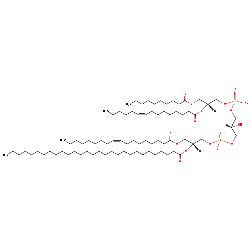 | YMDB02405 | CL(10:0/10:0/18:0/20:0) | [(2S)-3-({[(2R)-2,3-bis(decanoyloxy)propoxy](hydroxy)phosphoryl}oxy)-2-hydroxypropoxy][(2R)-2-(icosanoyloxy)-3-(octadecanoyloxy)propoxy]phosphinic acid | C67H130O17P2 1269.708 | |