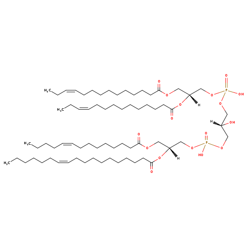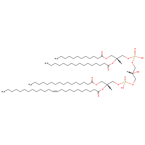 | YMDB07525 | CL(14:0/16:1(11Z)/16:1(9Z)/22:1(9Z)) | [(2R)-2-[(9Z)-docos-9-enoyloxy]-3-[(9Z)-hexadec-9-enoyloxy]propoxy][(2S)-3-({[(2R)-2-[(11Z)-hexadec-11-enoyloxy]-3-(tetradecanoyloxy)propoxy](hydroxy)phosphoryl}oxy)-2-hydroxypropoxy]phosphinic acid | C77H144O17P2 1403.93 | |