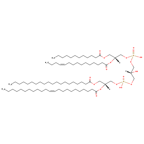 | YMDB06357 | CL(12:0/18:0/18:1(11Z)/20:0) | [(2S)-3-({[(2R)-3-(dodecanoyloxy)-2-(octadecanoyloxy)propoxy](hydroxy)phosphoryl}oxy)-2-hydroxypropoxy][(2R)-2-(icosanoyloxy)-3-[(11Z)-octadec-11-enoyloxy]propoxy]phosphinic acid | C77H148O17P2 1407.962 | |