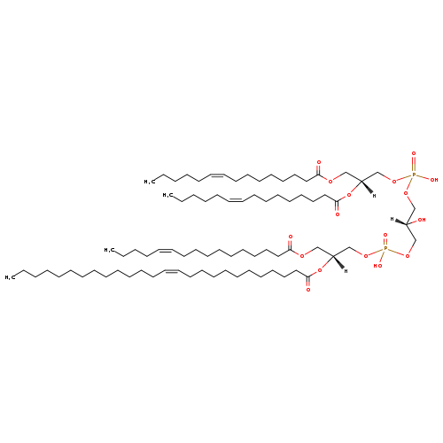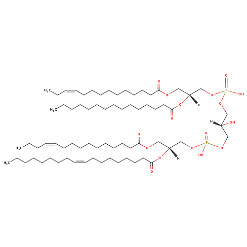 | YMDB09429 | CL(14:1(9Z)/15:1(9Z)/18:1(9Z)/25:1(11Z)) | [(2R)-2-hydroxy-3-({hydroxy[(2R)-3-[(9Z)-octadec-9-enoyloxy]-2-[(11Z)-pentacos-11-enoyloxy]propoxy]phosphoryl}oxy)propoxy][(2R)-2-[(9Z)-pentadec-9-enoyloxy]-3-[(9Z)-tetradec-9-enoyloxy]propoxy]phosphinic acid | C81H150O17P2 1458.022 | |