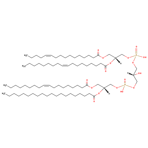 | YMDB10967 | CL(16:0/16:1(11Z)/20:0/20:1(13Z)) | [(2R)-2-[(11Z)-hexadec-11-enoyloxy]-3-(hexadecanoyloxy)propoxy][(2R)-2-hydroxy-3-({hydroxy[(2R)-2-[(13Z)-icos-13-enoyloxy]-3-(icosanoyloxy)propoxy]phosphoryl}oxy)propoxy]phosphinic acid | C81H154O17P2 1462.054 | |