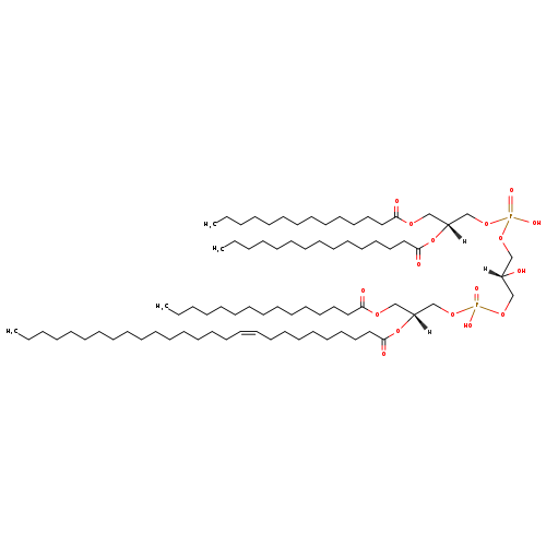| YMDB11480 | 1-MLCL(0:0/14:1(9Z)/14:1(9Z)/14:1(9Z)) | [(2R)-2,3-bis[(9Z)-tetradec-9-enoyloxy]propoxy][(2S)-2-hydroxy-3-({hydroxy[(2R)-3-hydroxy-2-[(9Z)-tetradec-9-enoyloxy]propoxy]phosphoryl}oxy)propoxy]phosphinic acid | C51H94O16P2 1025.245 | |