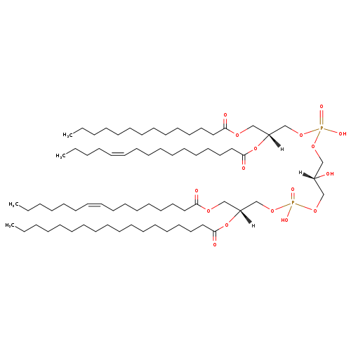 | YMDB09053 | CL(14:1(9Z)/14:1(9Z)/16:0/26:0) | [(2R)-2,3-bis[(9Z)-tetradec-9-enoyloxy]propoxy][(2R)-3-({[(2R)-2-(hexacosanoyloxy)-3-(hexadecanoyloxy)propoxy](hydroxy)phosphoryl}oxy)-2-hydroxypropoxy]phosphinic acid | C79H150O17P2 1434.0 | |