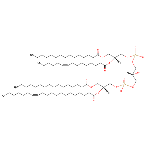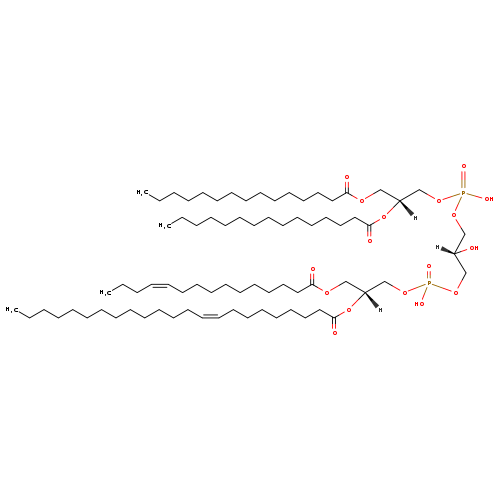 | YMDB09069 | CL(14:1(9Z)/14:1(9Z)/16:1(11Z)/24:1(11Z)) | [(2R)-2,3-bis[(9Z)-tetradec-9-enoyloxy]propoxy][(2R)-3-({[(2R)-3-[(11Z)-hexadec-11-enoyloxy]-2-[(11Z)-tetracos-11-enoyloxy]propoxy](hydroxy)phosphoryl}oxy)-2-hydroxypropoxy]phosphinic acid | C77H142O17P2 1401.914 | |