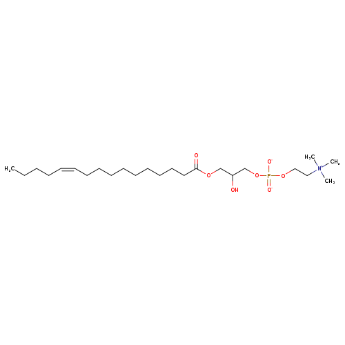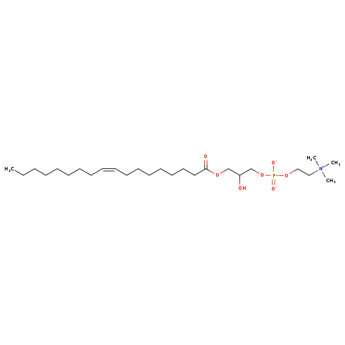 | YMDB13316 | Lyso-PC(18:1(9Z)/0:0) | {2-[({2-hydroxy-3-[(9Z)-octadec-9-enoyloxy]propoxy}(-lambda3-oxidanidylidene)oxido-lambda5-phosphanyl)oxy]ethyl}trimethylazanium | C26H52NO7P 521.676 | |
