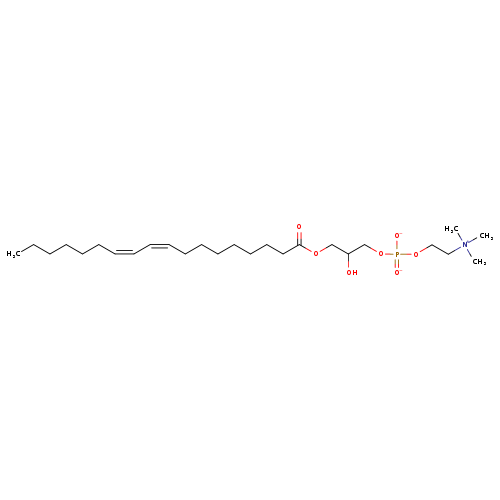 | YMDB13317 | Lyso-PC(18:2(9Z,11Z)/0:0) | {2-[({2-hydroxy-3-[(9Z,11Z)-octadeca-9,11-dienoyloxy]propoxy}(-lambda3-oxidanidylidene)oxido-lambda5-phosphanyl)oxy]ethyl}trimethylazanium | C26H50NO7P 519.66 | |