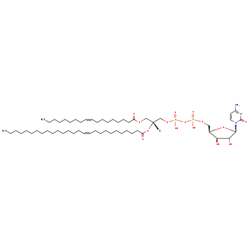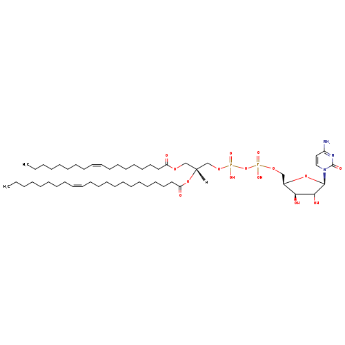 | YMDB12474 | CDP-DG(18:1(9Z)/25:1(9Z)) | {[(2R,3R,5R)-5-(4-amino-2-oxo-1,2-dihydropyrimidin-1-yl)-3,4-dihydroxyoxolan-2-yl]methoxy}({hydroxy[(2R)-3-[(9Z)-octadec-9-enoyloxy]-2-[(9Z)-pentacos-9-enoyloxy]propoxy]phosphoryl}oxy)phosphinic acid | C55H99N3O15P2 1104.351 | |